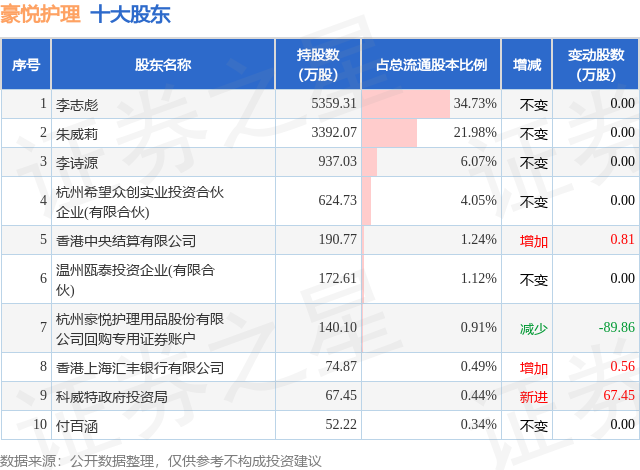 根据豪悦护理2025年一季报公布的十大股东详情如下: